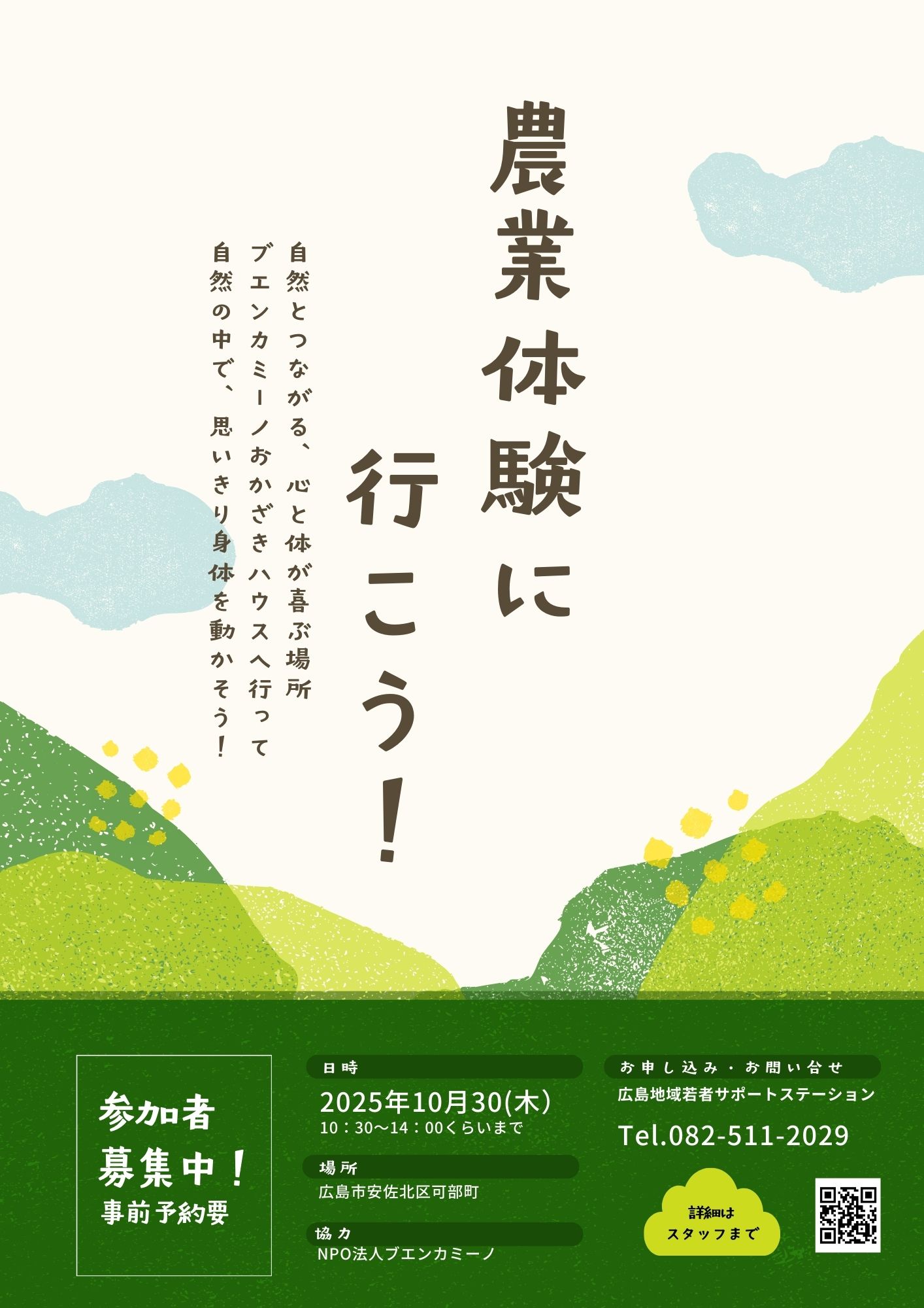 投稿日: 2025-09-252025-10-16 投稿者: tanoue2025年10月30日(木)農業体験に行こう! 10月30日(木)安佐北区可部ブエンカミーノさんへ農業体験に行きます。10時30分から14時ころを予定しています。人数に限りがありますので、お申し込みは担当スタッフを通じてお早めにどうぞ。 Tweet