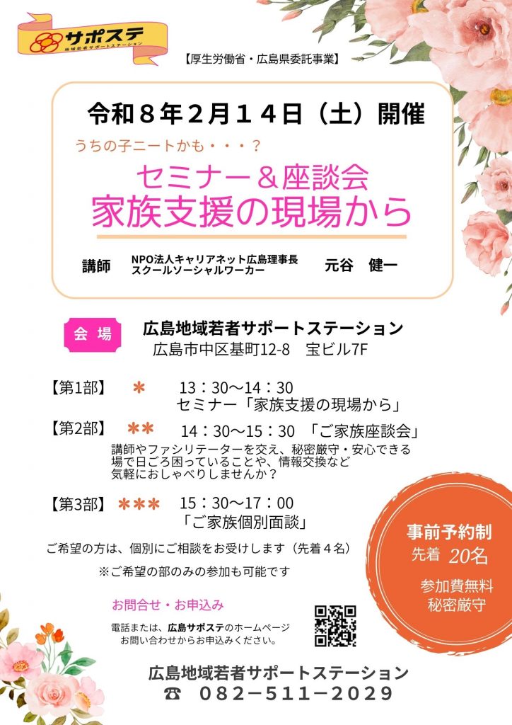 うちの子ニートかも・・・?と悩むご家族の皆さま、2月14日(土)どうぞサポステへおいでください。スクールソーシャルワーカーがご家族支援の現場からをテーマにお話しします。そのあと、若者支援に長年取り組んできたスタッフらも加わり、安心できる場でいろいろ情報交換しませんか?どうぞお申込みください。